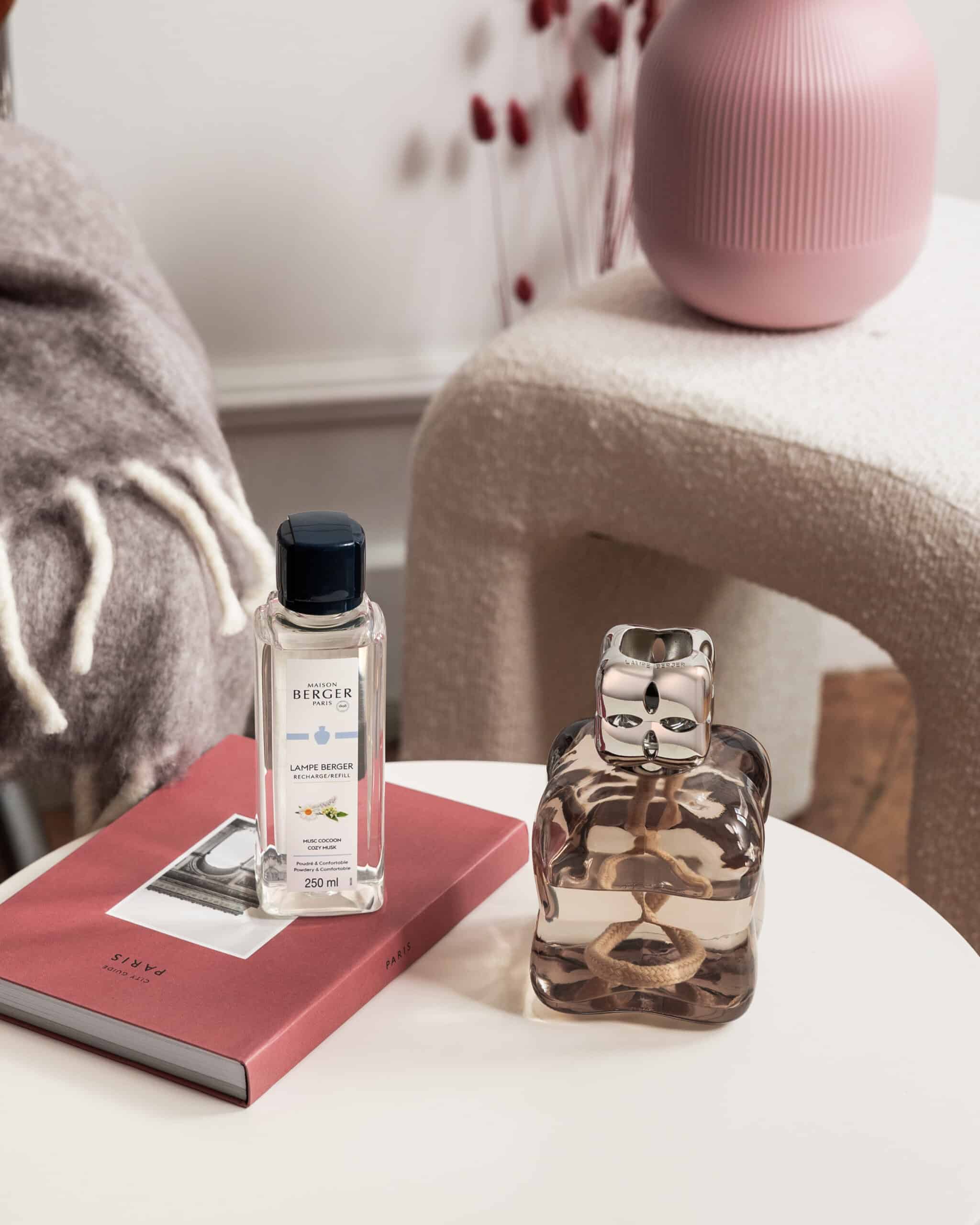 Se presenta en un cofre que incluye: 1 tapón normal, 1 tapón difusor, 1 mecha, 1 pequeño embudo y 1 líquido para lámpara catalítica con aroma Musc Cocoon 250 ml.