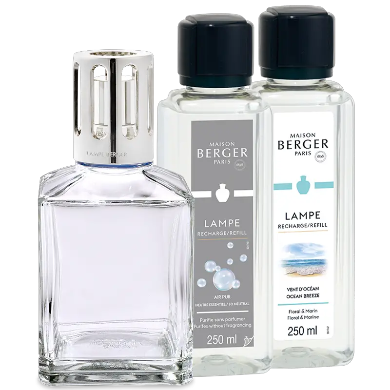 Se presenta en un cofre que incluye: 1 tapón normal, 1 tapón difusor, 1 mecha, 1 pequeño embudo, 1 recarga para lámparas catalíticas aroma Vent d’Océan y 1 recarga para lámparas catalíticas Air Pur (sin aroma) 250 ml.