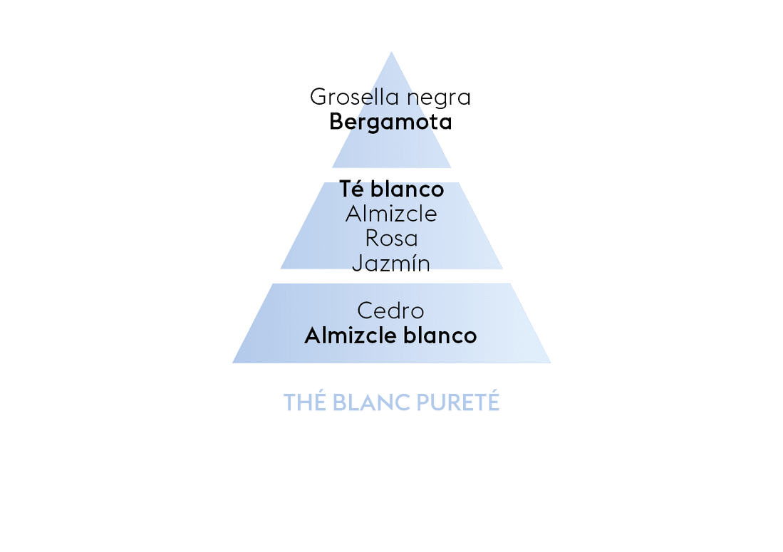 Thé Blanc Pureté, un aroma suave, mezcla el olor de la grosella negra, la bergamota, el té blanco, la rosa y el jazmín, entre otros.