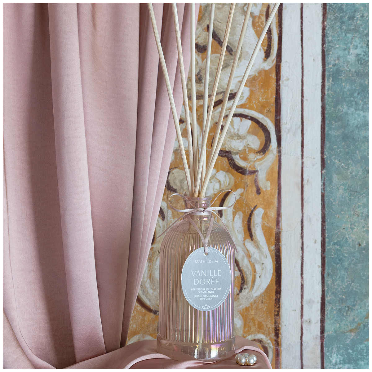 El mikado para hogar Vanille Dorée – 500ml de Mathilde M, de colección limitada en un rosa nacarado y brillante, crea una atmósfera agradable y acogedora por su aroma cálido y adictivo, de notas florales con toque salado junto a la cremosa vainilla y la amaderada haba tonka.