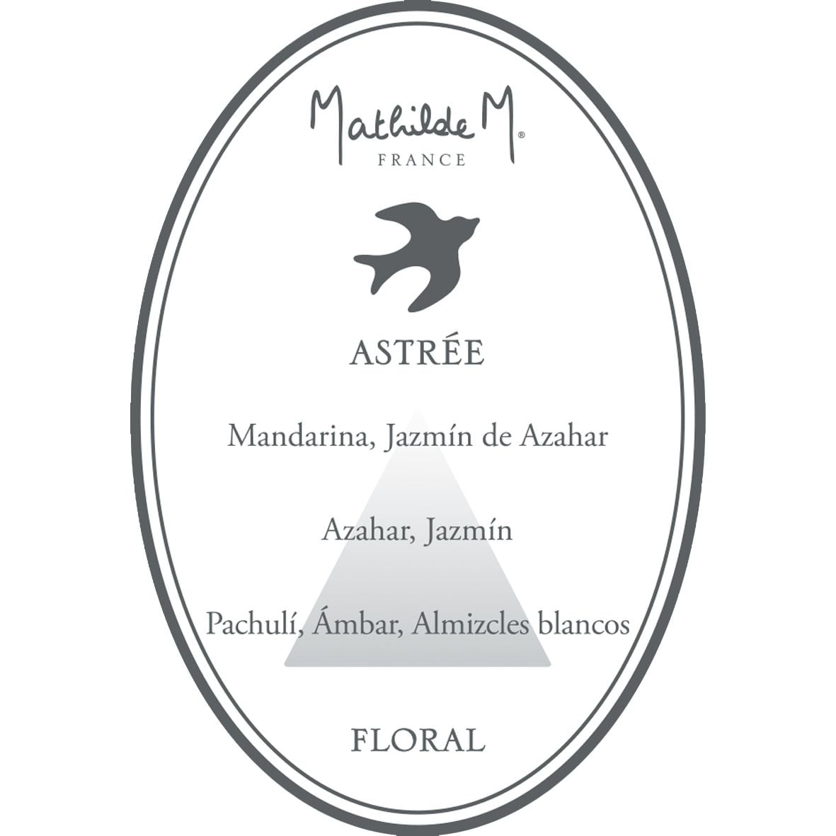 Explora la sutileza del perfume de textil Astrée de Mathilde M., en envase de 75 ml. Su fragancia floral, mezcla la mandarina, el jazmín, el azahar y los almizcles blancos, aportando al ambiente sensación de bienestar.